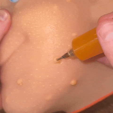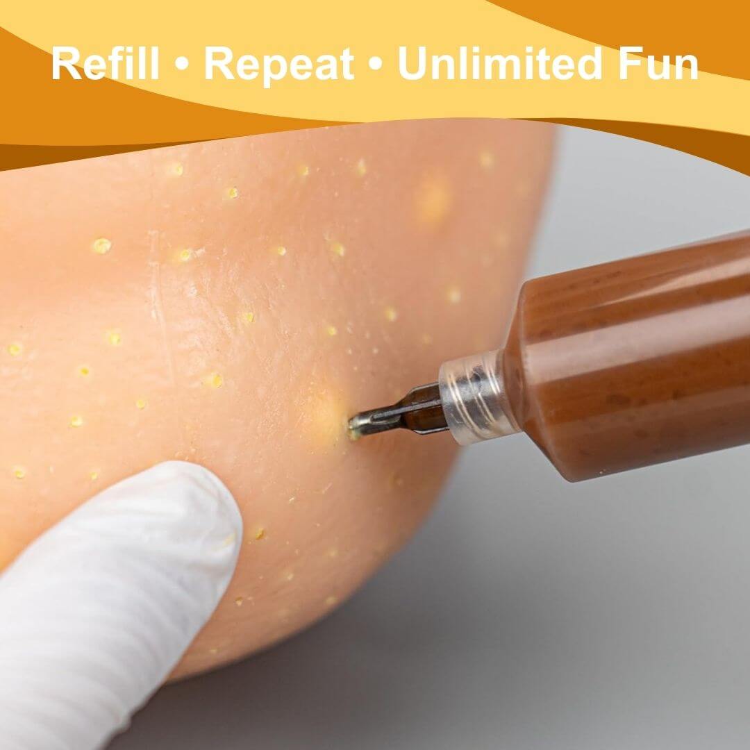 Each Pimple Paddy™ includes a premium silicone head and syringes filled with a special, realistic pimple-like filling. The quantity depends on the kit you choose (2 or 4 syringes).
