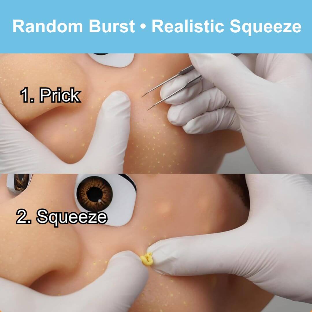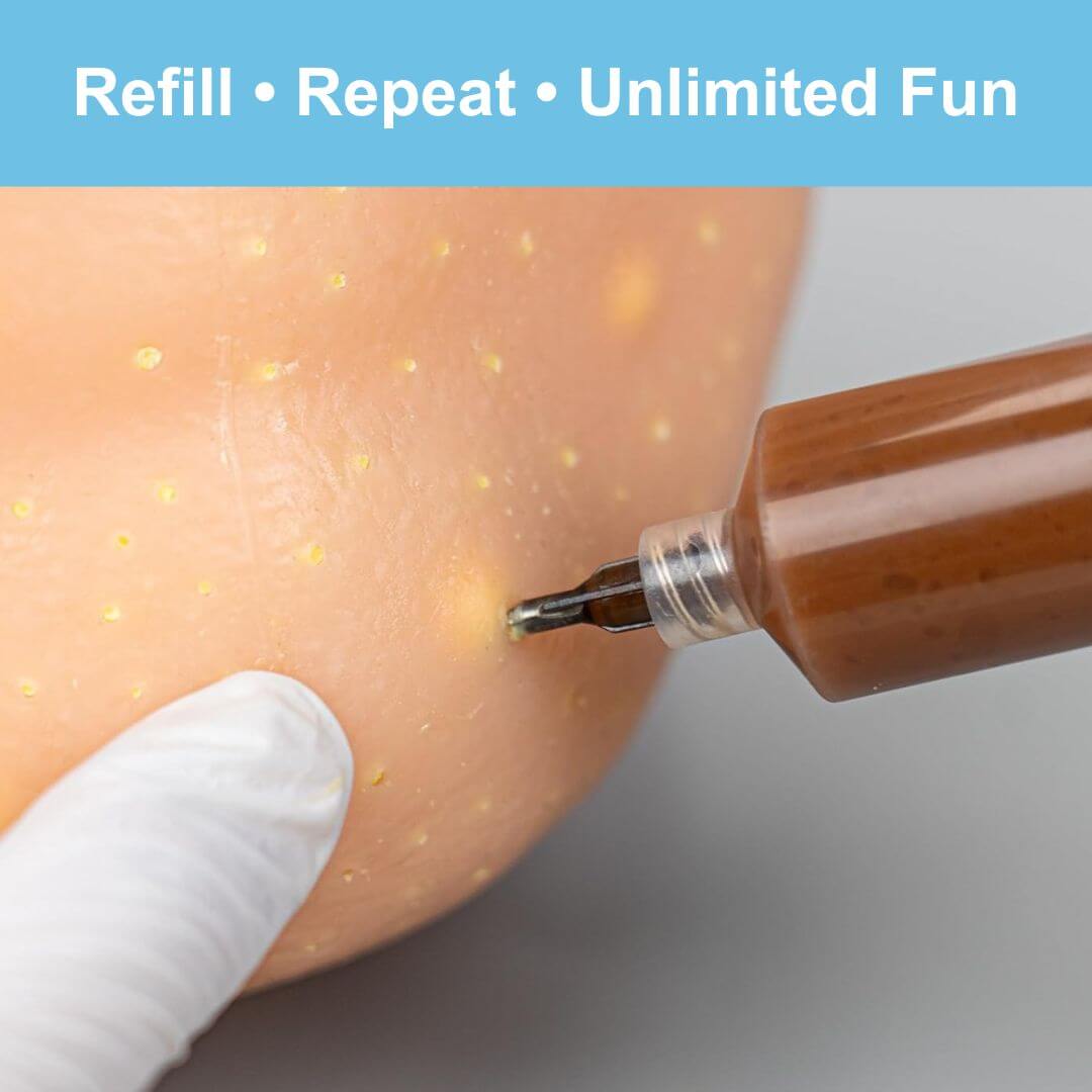 Cada Pimple Paddy™ incluye la cabeza de silicona premium y jeringas con relleno especial que simula granos realistas. La cantidad depende del kit que elijas (2 o 4 jeringas)